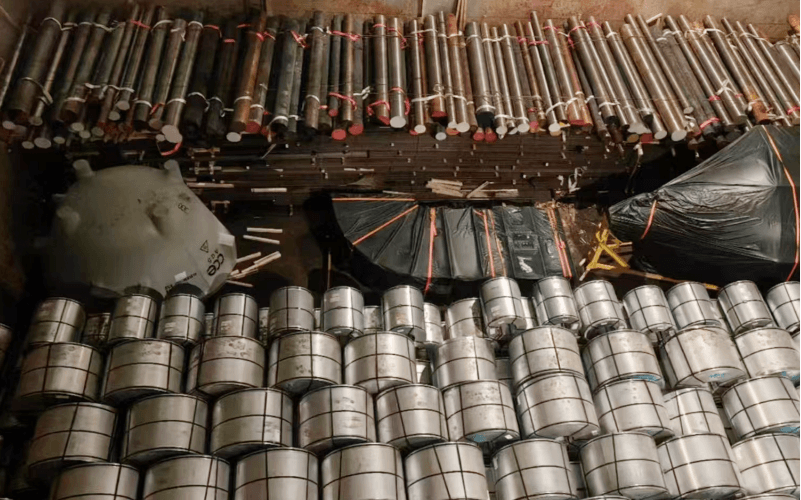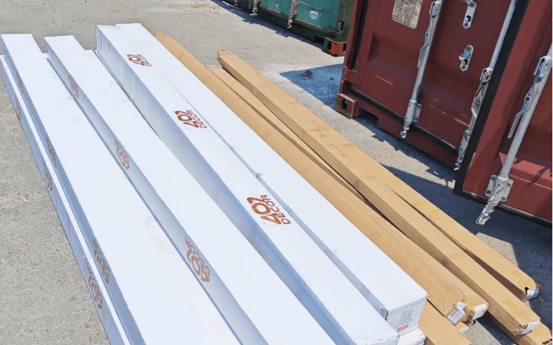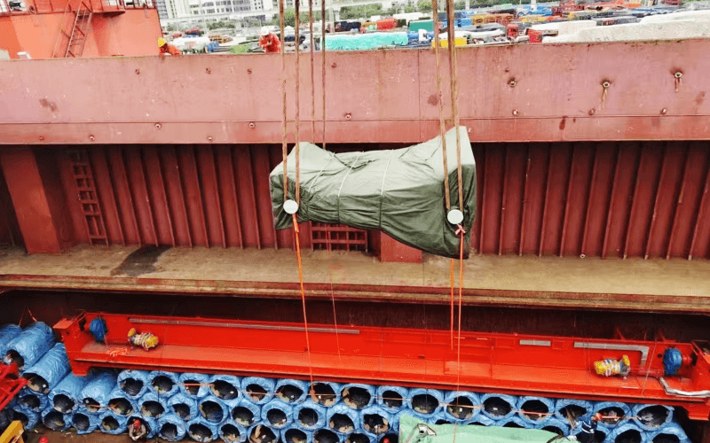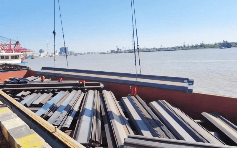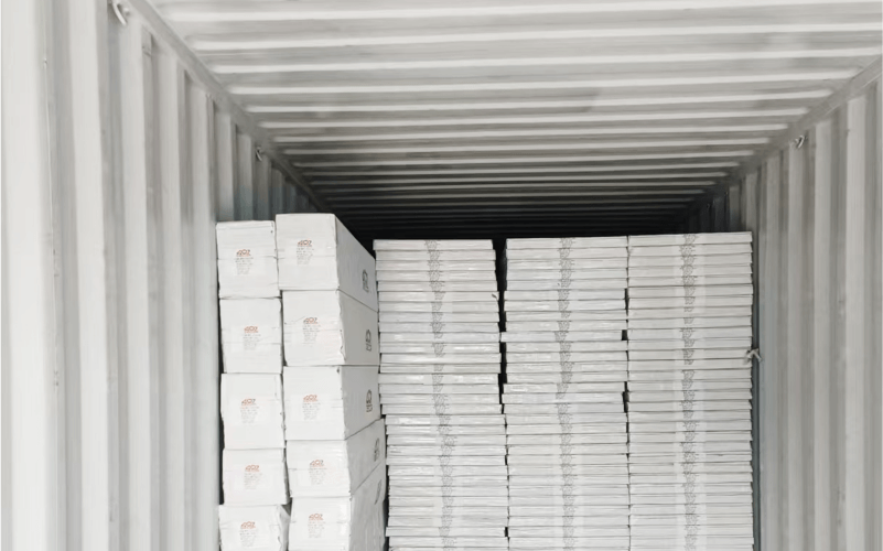 A professional team formulates a container loading plan based on the size and weight of building materials. For instance, glass is placed vertically with shock-absorbing brackets, while steel is stacked to optimize the container capacity utilization.